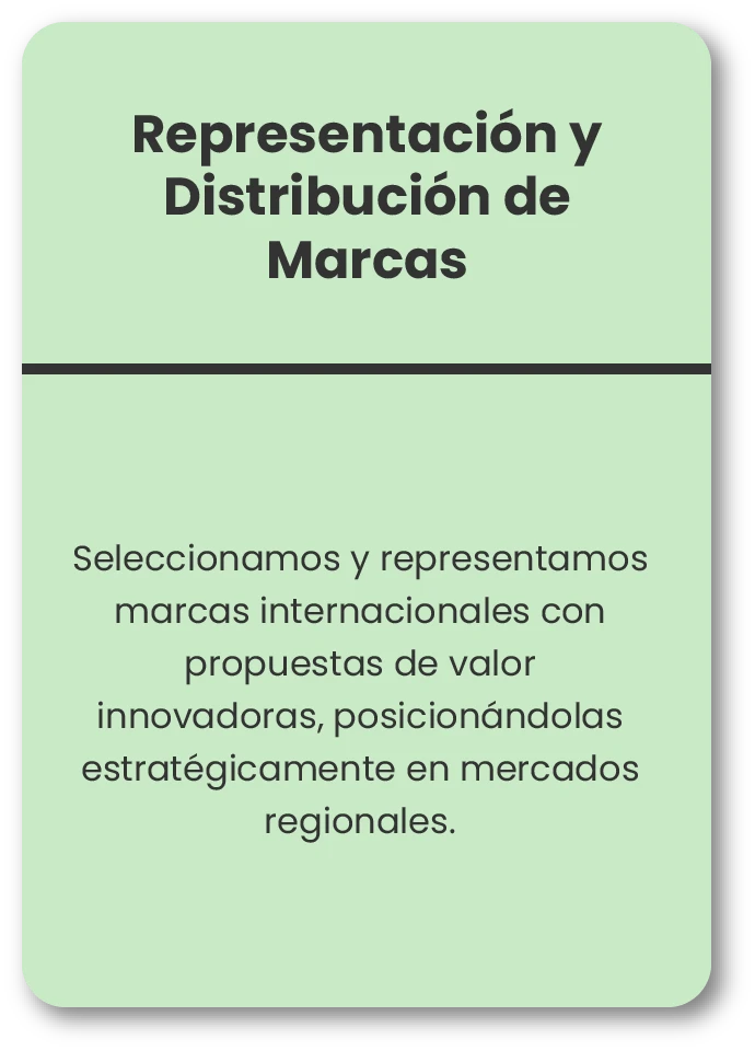 Nos especializamos en la representación, distribución y comercialización de marcas internacionales, adaptándolas al mercado local y regional.